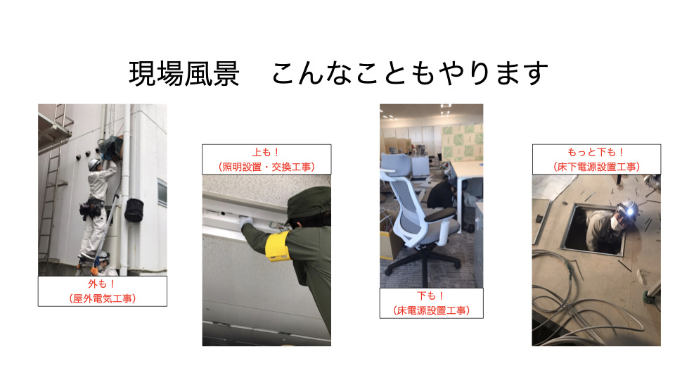 業務内容 | 各種建物内の電気・配線・工作物設置工事 |